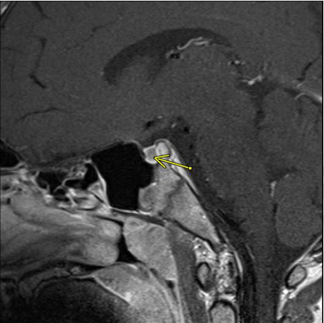 Presentation was concerning for Cushing syndrome and 1 mg overnight dexamethasone suppression test was performed with AM cortisol 2.0 mcg/dL and ACTH 15 pg/mL. Despite the indeterminate results, over a 3 month period he gained an additional 4.1 kg without height gain and appeared more Cushingoid. A 48- hour low dose dexamethasone suppression test was performed; baseline 8 am cortisol was 22.1 mcg/dL, 48- hour cortisol was 5.8 mcg/dL, and ACTH was 29 pg/ mL. With biochemical evidence of Cushing disease, MRI of the brain was performed revealing a heterogeneous filling defect within the left and right lateral aspects of the pituitary. A microadenoma was not visualized, but could not be excluded (Figure 1), (Figure 2).