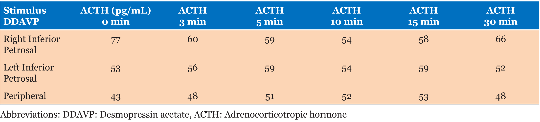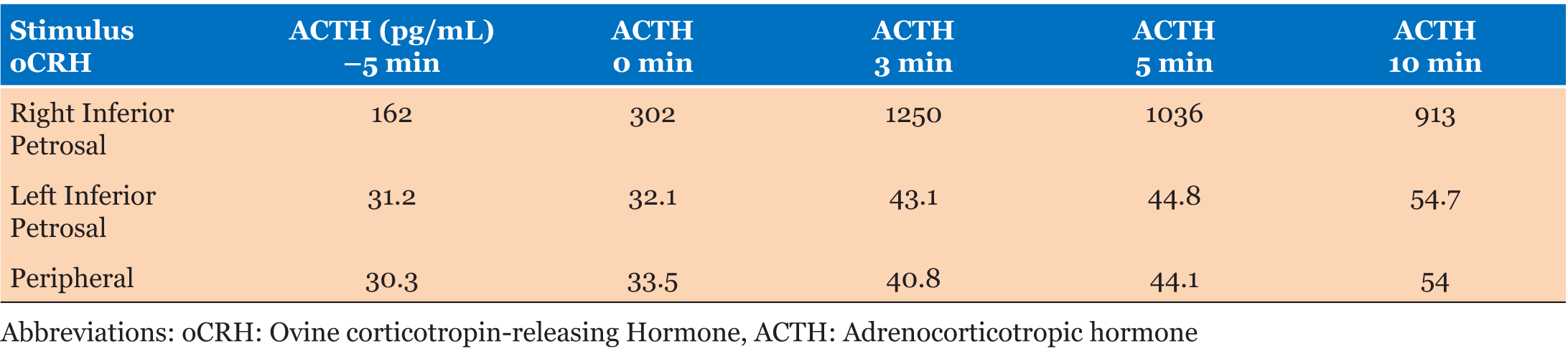 As laboratory testing and non-invasive imaging have low sensitivity in diagnosing Cushing disease, the gold standard diagnostic test remains bilateral inferior petrosal sinus sampling (IPSS) [2]. IPSS is performed by obtaining ACTH from both the right and left inferior petrosal sinuses as well as peripherally before and after stimulation using either ovine corticotropin-releasing hormone (oCRH) or more recently desmopressin. Desmopressin is increasingly being used over oCRH as the stimulating agent for inferior petrosal sinus sampling (IPSS). This was compounded by a national shortage of oCRH and a cost 15 times that of desmopressin that further pushed the need for alternative methods of testing [2],[3]. In available studies, desmopressin has been found to be a comparable stimulant in IPSS testing, with similar sensitivity and specificity as oCRH (both medications have been found to have sensitivity and specificity over 90%) [4],[5]. This case presents a pediatric patient that had an ACTH-secreting pituitary adenoma that was not diagnosed using desmopressin as the stimulating agent for IPSS, but repeat testing using the gold standard of oCRH as the stimulant, allowed identification of a pituitary adenoma, which was subsequently removed.